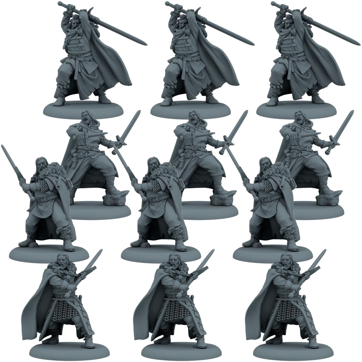 The Sworn Brothers unit box forms the core force for the Night’s Watch in the A Song of Ice and Fire: Tabletop Miniatures Game. Their strong armor deflects blows and their training keeps them from running off easily. On the offensive side of the scales, their prowess with the greatsword is second to none, dealing critical strikes and sundering even the toughest enemy armor. Meanwhile, the Watch Captain Attachment lets the unit have two Vows assigned to the unit at a time.