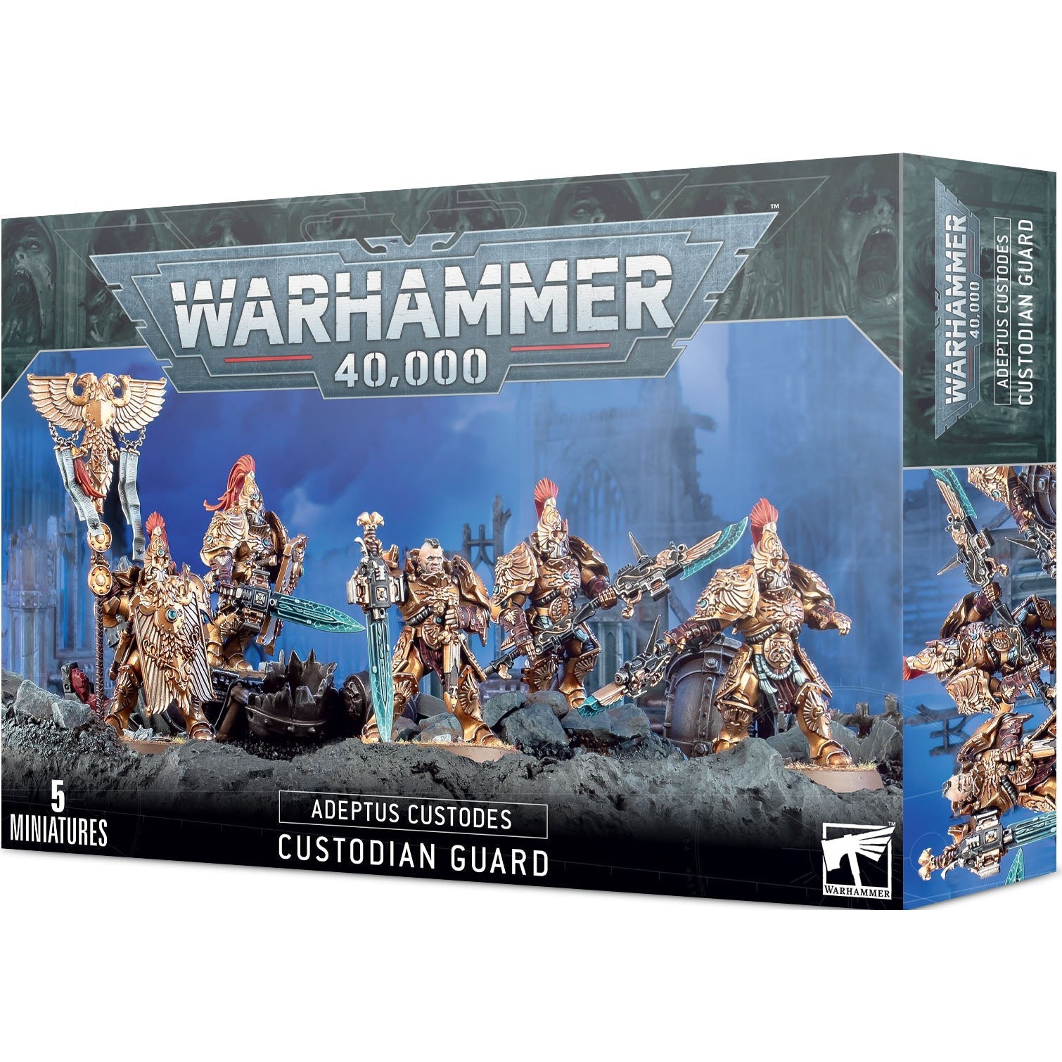 This multi-part plastic kit contains the components necessary to assemble a set of 5 Adeptus Custodes Custodian Guard, armed with either guardian spears or sentinel blades and storm shields. 1 model can be assembled as a Shield-Captain, featuring a cloak and choice of 2 heads, and 1 can be assembled as a Vexilus Praetors, carrying Custodes Vexilla.