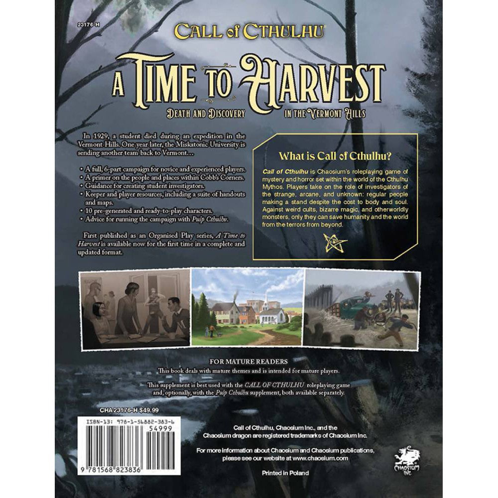 A Time To Harvest contains new rules and advice for creating student investigators. Additionally, there is information on incorporating existing characters into the campaign by bringing in your investigators that have cut their teeth in other scenarios for Call of Cthulhu.
