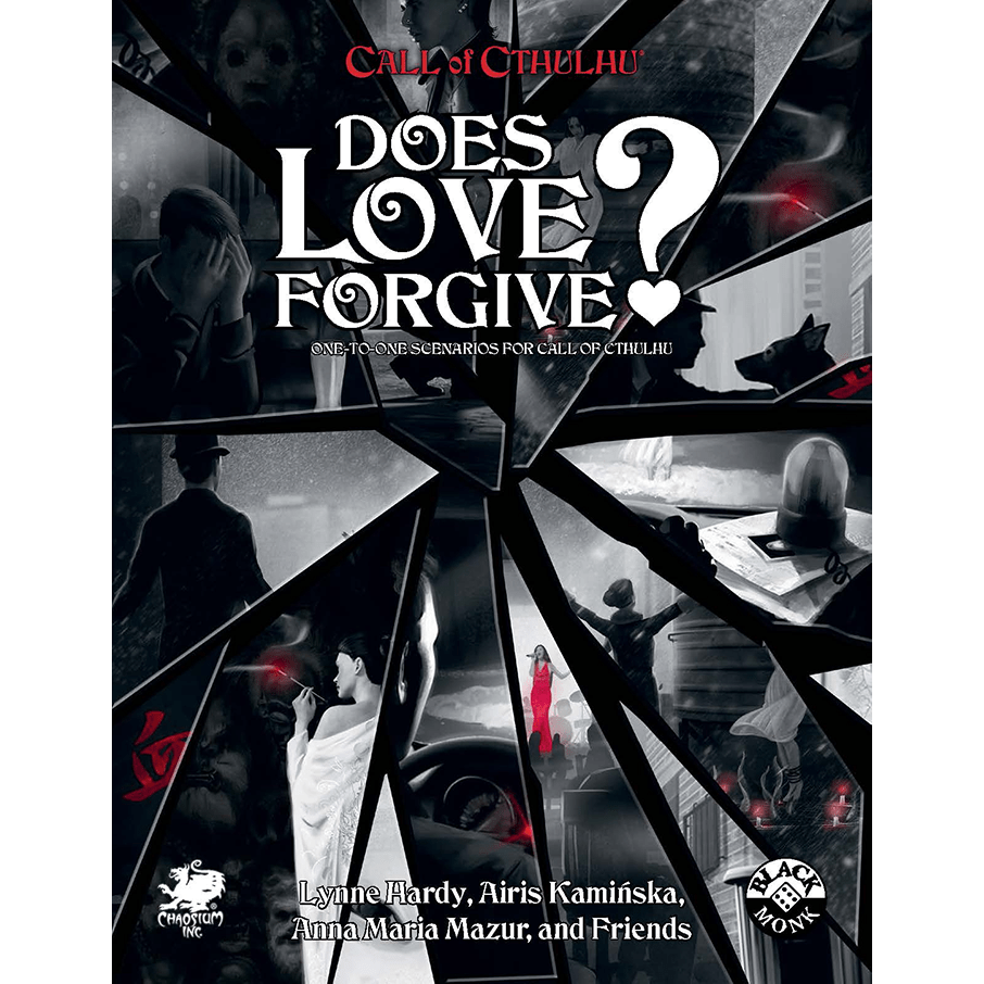 Does Love Forgive? is a collection of two special scenarios for Call of Cthulhu for one Keeper and one player. Both adventures are perfect for a fun evening of gaming for two people. Each scenario can be played over the course of one to two sessions, and is suitable for Keepers of all experience levels.