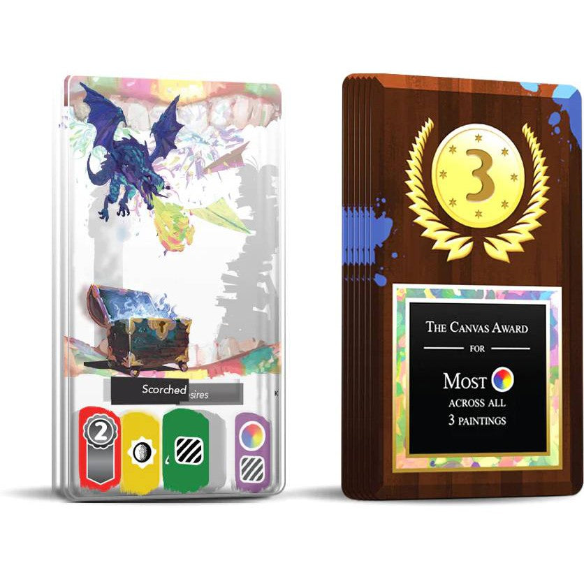 In Canvas, you play as a painter competing in an art competition. Players will collect art cards, layering 3 of them together to create their own unique Painting. Each card contains a piece of artwork as well as a set of icons used during scoring. Icons will be revealed or hidden based on the way players choose to layer the cards making for an exciting puzzle. Paintings are scored based on a set of Scoring cards which will change each game. Once players have created and scored 3 paintings the game ends.