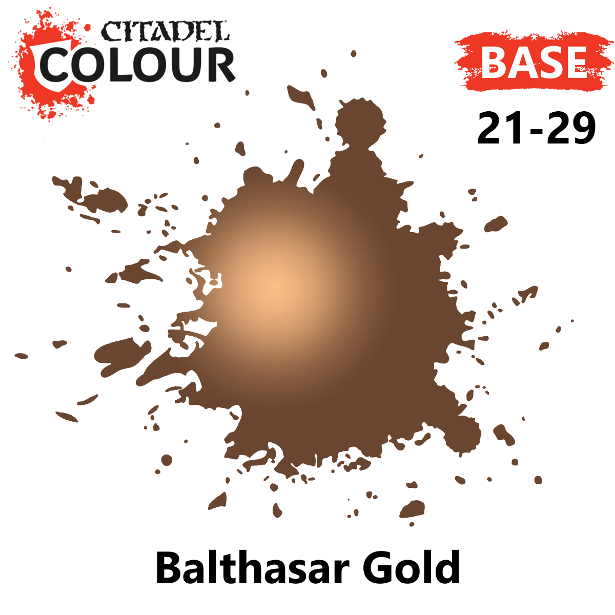 Balthasar Gold is a Citadel Base paint.Citadel Base paints are high quality acrylic paints specially formulated for basecoating your Citadel miniatures quickly and easily. They are designed to give a smooth matte finish over black or white undercoats with a single layer.This pot contains 12ml of Balthasar Gold one of 34 Base paints in the Citadel Paint range. As with all of our paints it is a non-toxic water-based acrylic paint designed for use on plastic metal and resin Citadel miniatures.