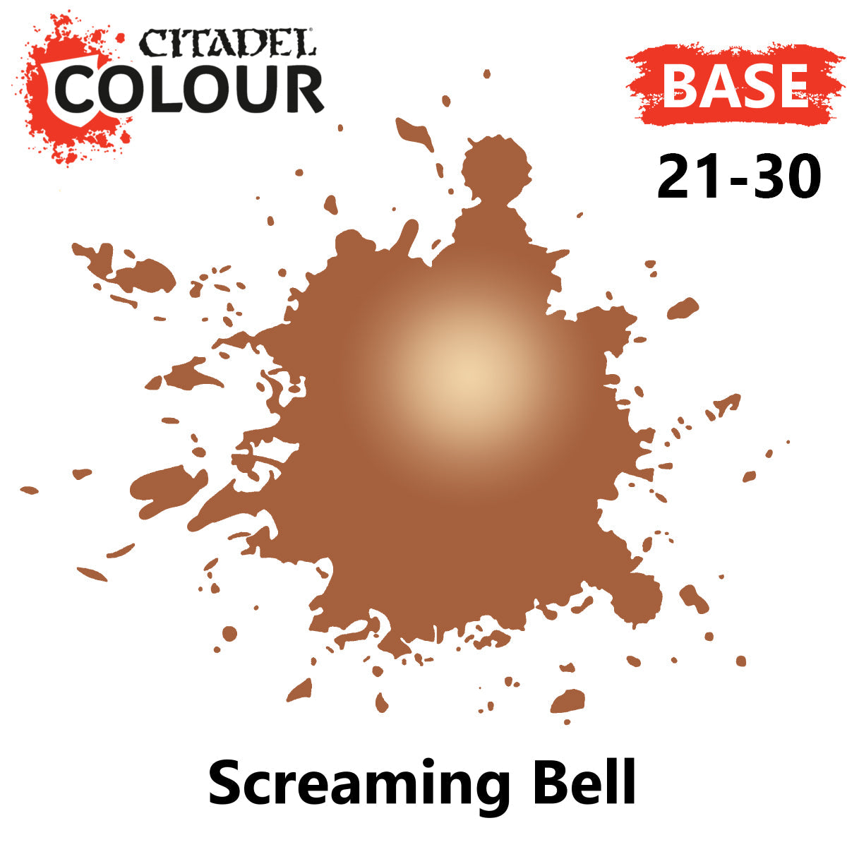Screaming Bell is a Citadel Base paint.Citadel Base paints are high quality acrylic paints specially formulated for basecoating your Citadel miniatures quickly and easily. They are designed to give a smooth matte finish over black or white undercoats with a single layer.This pot contains 12ml of Screaming Bell one of 34 Base paints in the Citadel Paint range. As with all of our paints it is a non-toxic water-based acrylic paint designed for use on plastic metal and resin Citadel miniatures.