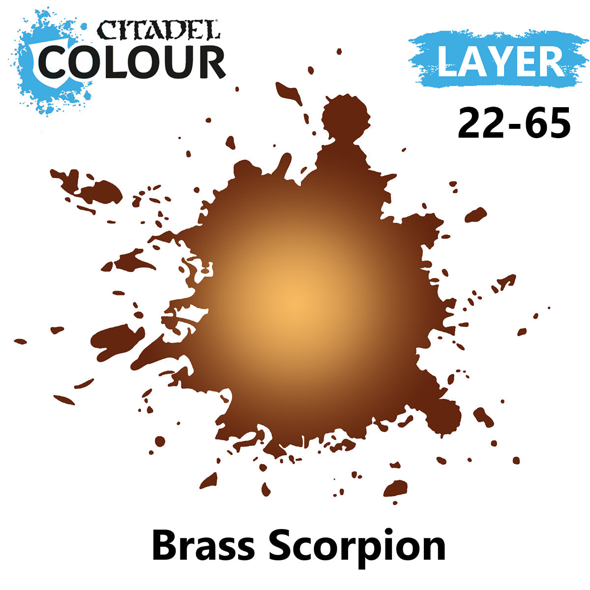 Brass Scorpion is a Citadel Layer paint.Citadel Layer paints are high quality acrylic paints and with 70 of them in the Citadel Paint range you have a huge range of colours and tones to choose from when you paint your miniatures. They are designed to be used straight over Citadel Base paints (and each other) without any mixing. By using several layers you can create a rich natural finish on your models that looks fantastic on the battlefield.This pot contains 12ml of Brass Scorpion one of 70 Layer paints in the Citadel Paint range. As with all of our paints it is a non-toxic water-based acrylic paint designed for use on plastic metal and resin Citadel miniatures.