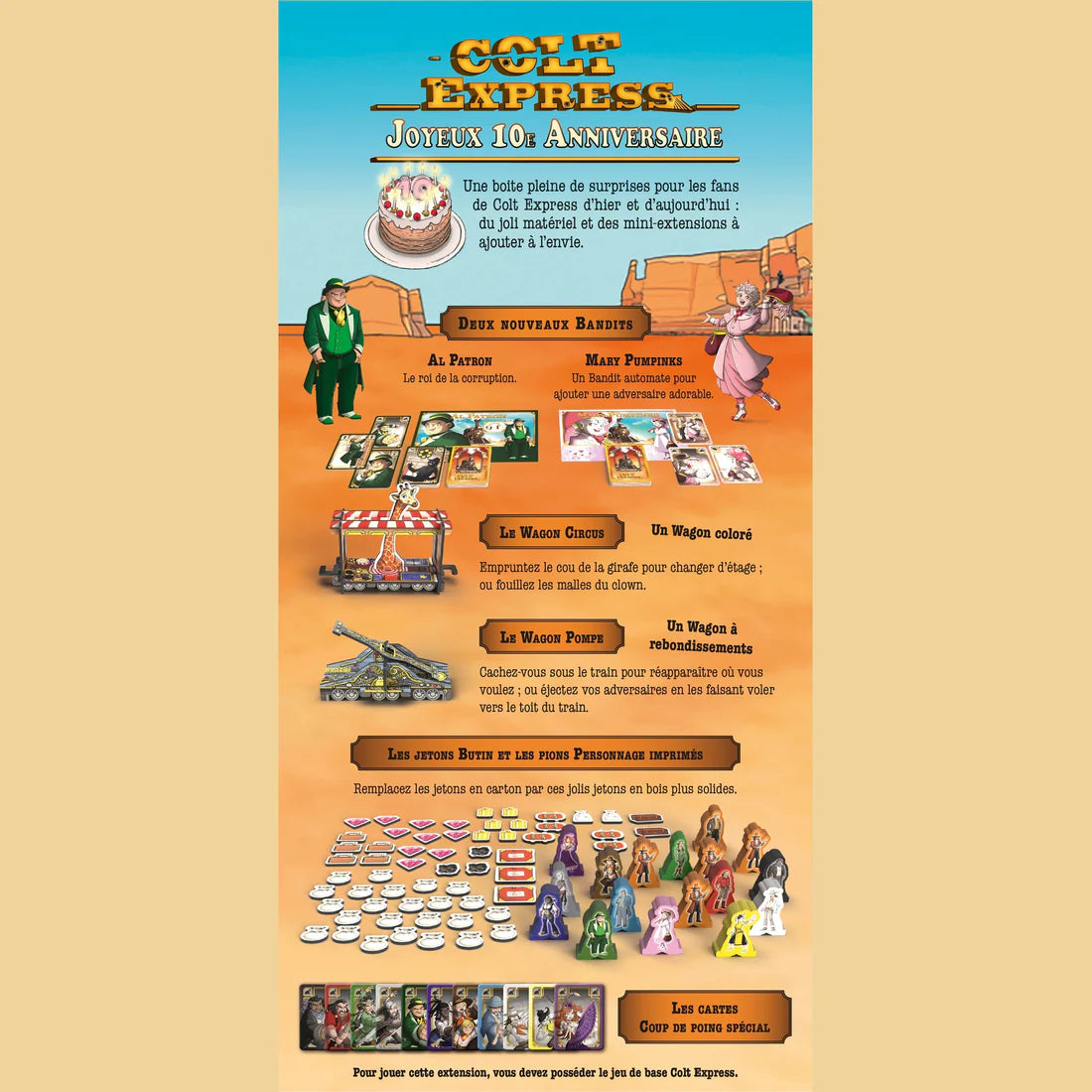 Colt Express - Joyeux 10e Anniversaire est une boite pleine de surprises pour les fans de Colt Express d'hier et d'aujourd'hui : du joli matériel et des mini-extensions à ajouter à l'envie. Contenu :