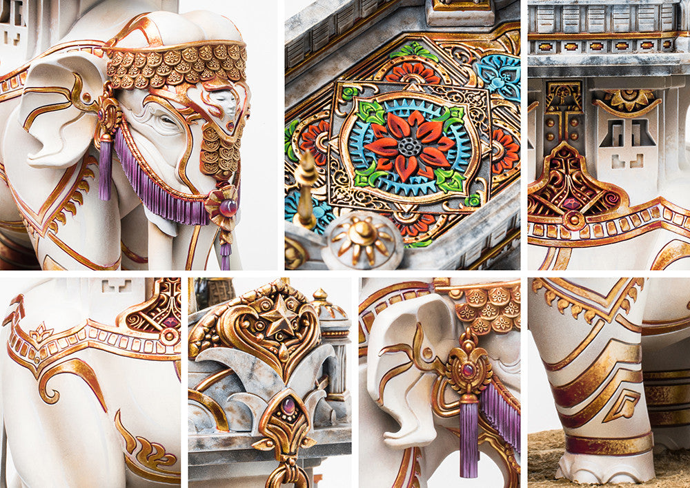 ● 1 Plastic Monster Miniature ● 4 Dhanur Disciples Crew Miniatures ● 1 Alternative Mahut Head ● 1 Monster Base and Stand ● 4 Infantry Bases and Stand ● 2 Command Card