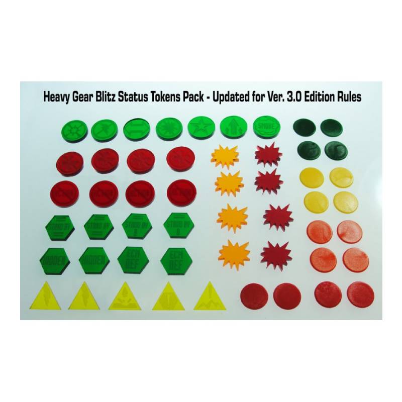 Heavy Gear Blitz Status Tokens Pack for the HGB 3rd Edition Rules. Includes 36 laser etched acrylic tokens (about 20mm in size) and 16 plastic damage chips (16mm in size).