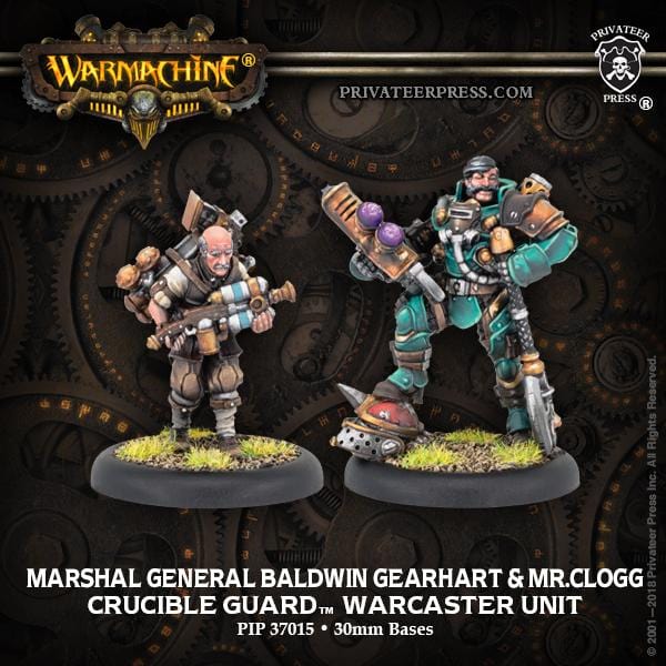 A Cygnaran-born mercenary warcaster, Marshal General Baldwin Gearhart has made a career of fighting and has enjoyed every moment along the way. He is never happier than when facing long odds and overwhelming numbers, much to the chagrin of his manservant Mr. Clogg. Gearhart has dragged his assistant across the Iron Kingdoms and into the wild yonder beyond the civilized world on countless hunting expeditions, and now he delights in knocking Khadorans around the battlefield in occupied Llael. Whatever enemies the Crucible Guard faces in the years ahead, the marshal general stands ready to deploy his unusual arsenal against them.