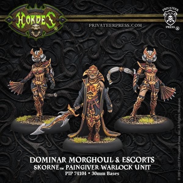 After a lifetime spent bloodying his hands on behalf of others, Morghoul has emerged from the world of shadows to command a house like no other—the paingivers. In battle, Dominar Morghoul is attended by two paingiver escorts who aid him in crippling his foes so that his blade may find purchase, and he empowers his army with mortitheurgical might so that they may shift like the sands of the desert to swiftly fell their foes.