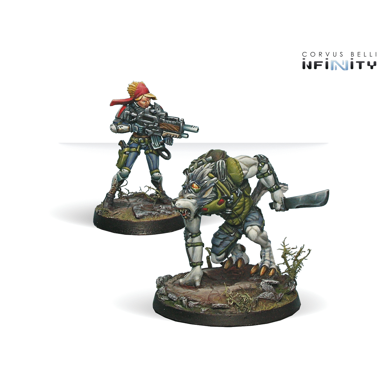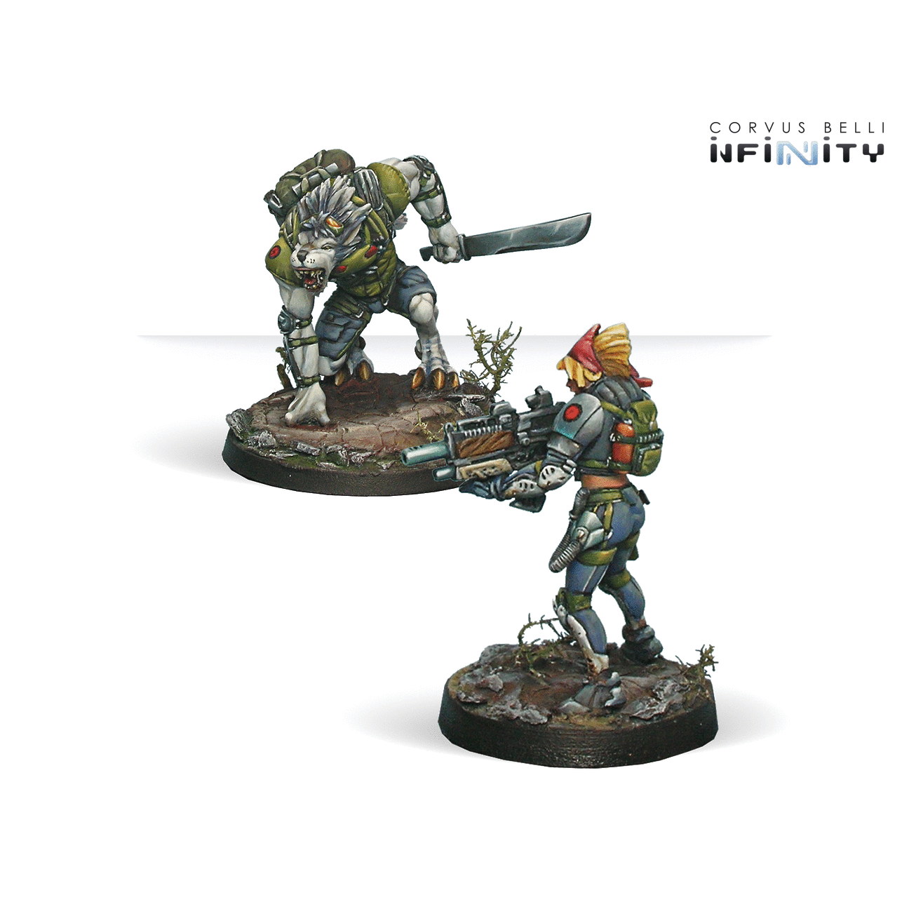 The Mirage-5 Team, formed by Berthier and Duroc, is one of the oldest and most successful teams. Lieutenant Margot Berthier is an ex-NCO from the Merovingian airborne troopers, from there passing to the Special Operations Command of the Ariadnan Army’s Military Intelligence. She also lead an airborne shock commando troop in the Ariadna Exemption Zone, heading various extremely successful attacks against Panoceanian forces that tried to advance in the area. However, the commando group lost effective strength from every mission due to the high risk rate. After six months of operations, the only survivors of the commando group were her and another NCO, so the unit was disbanded. Trying to overcome the deaths of her comrades, Margot requested a transfer to the Moblots, the Merovingian heavy infantry. The new environment helped her to calm down and polish her combat skills. When she felt restored, Margot came back to Intelligence. A few missions later, she recovered her Mirage Team status. In Intelligence circles, she is the only operative readmitted to the Mirage Teams after a leave of absence. Berthier has the reputation of being a shrewd, tough and sly officer, and an excellent shot as well. She has a personal and deadly style, characterized by her absolute precision and an almost perverse apparent lack of effort. In one of her missions she met Duroc, perceived his potential, and recruited him to the Mirage Teams. Since then, they have constituted a tight tactical team, covering their backs mutually. Margot is the brains and the markswoman of the team, while Duroc is the muscles and provides the psychological impact of extreme and sudden violence.