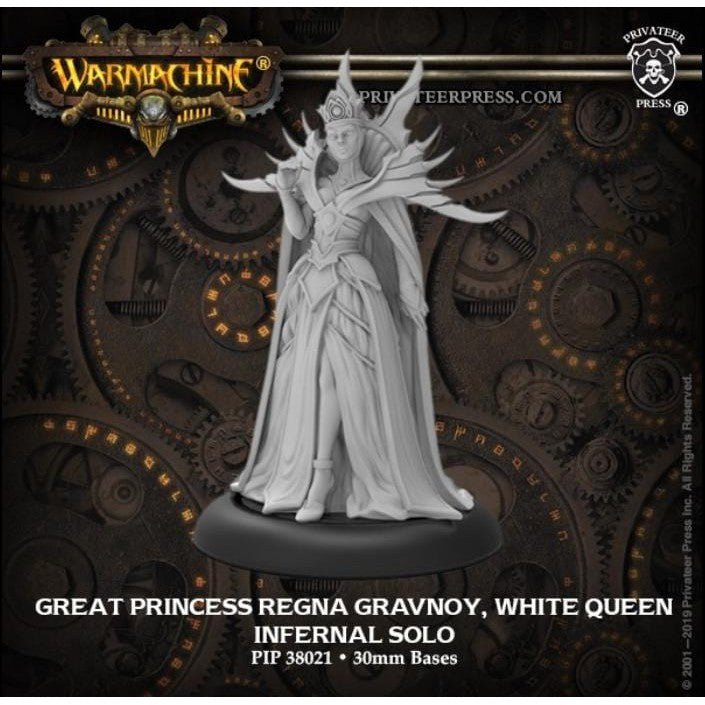 That the infernals have their hooks deep in mortal affairs is demonstrated by their subversion of one of the Khadoran Empire’s highest-ranking nobles. Great Princess Regna Gravnoy has earned respect as the ruler of Gorzytska Volozk through her proven intelligence, political acumen, and undeniable ruthlessness. She has also been, for most of her life, a secret infernalist. She has perfected the rituals by which lesser horrors can be summoned and bound, and she enjoys the thrill of wielding hellfire to incinerate her foes. Calling herself the White Queen, she anticipates ruling whatever remains of the frozen north.