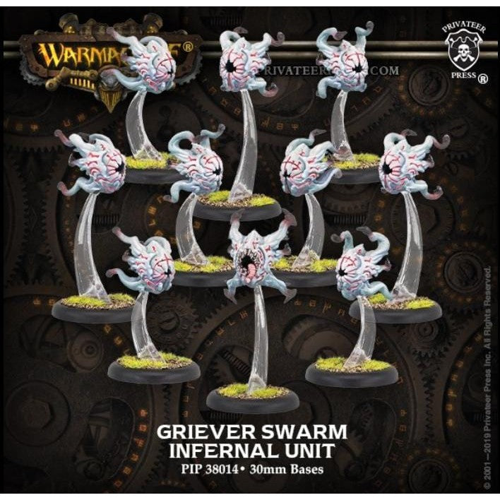 Griever swarms drift swiftly through the air and travel in small packs, disgorging void fire at their chosen prey. Though considered infernals, as they are native to the same realm, they are closer to animals or beasts. Their behavior suggests a strangely uncanny understanding of their environment and their prey as they silently coordinate to attack. They are surprisingly durable, and their mode of movement is erratic, making them hard for mortals to anticipate. Inky darkness follows them, pulled from beyond Caen, and the sight of their approach presages certain doom.