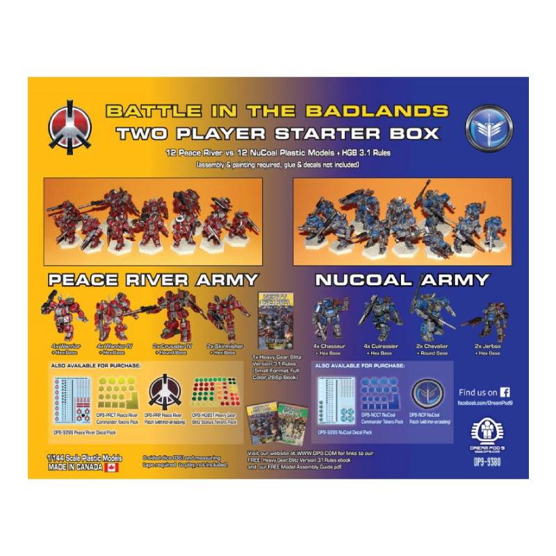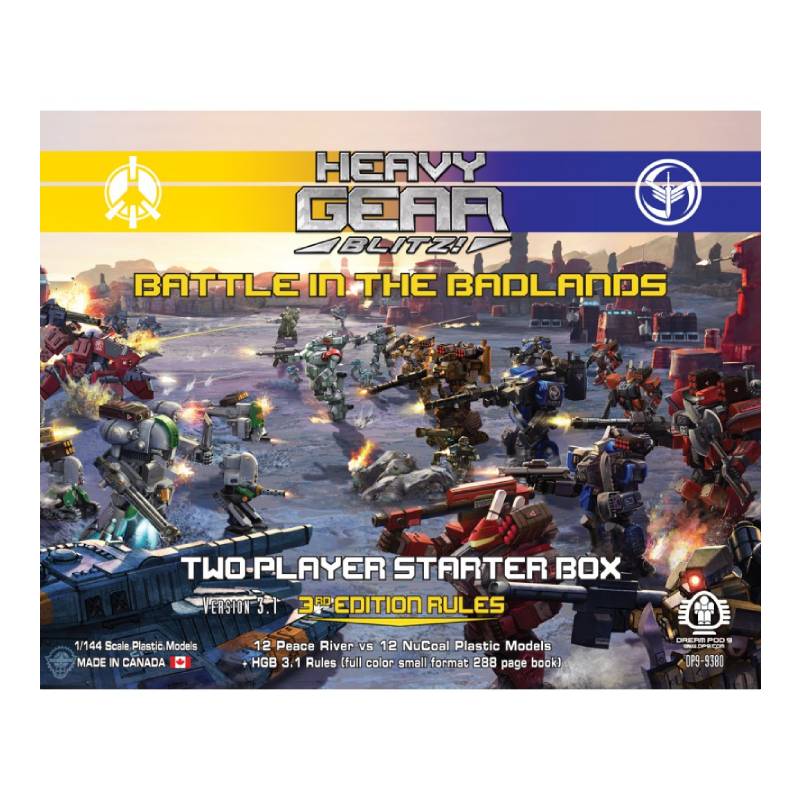 Heavy Gear Blitz - Battle in the Badlands - Two Player Starter Box includes 12 Peace River Plastic Models vs 12 NuCoal Plastic Models, plus HGB 3.1 Rules (small format full color book).