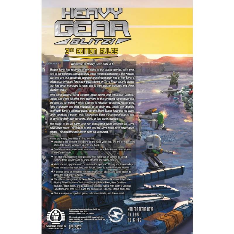 DP9-9375 Heavy Gear Blitz! Tabletop Wargaming - 3rd Edition Rules - Version 3.1  - Small Format (5.5" x 8.5") full color, 288 pages.