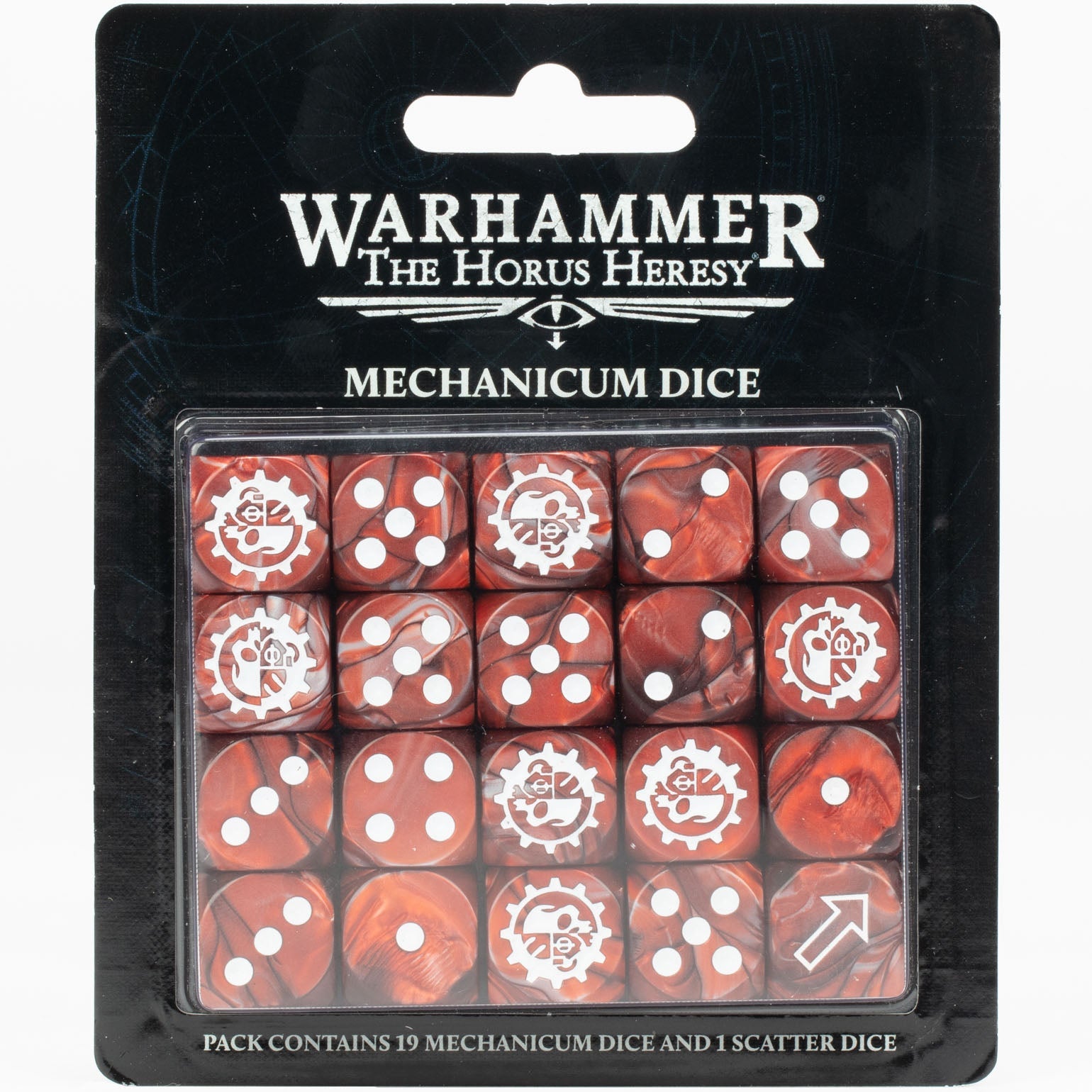 Contents: 20x grey pearlescent swirl dice with black ink, measuring 16mm along each edge, including: – 19x D6 with a Mechanicum on the '6' face – 1x Scatter Dice
