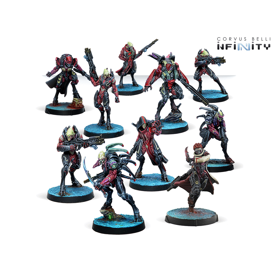 This box includes ten miniatures for the Shasvastii Army: Three Nox Troopers with Combi Rifle, one Mentor with Boarding Shotgun, one Caliban with Boarding Shotgun, one Caliban with Spitfire, one Shrouded with Combi Rifle, one Gwailo with HMG, one Malignos with Boarding Shotgun and the special character Sheskiin with Red Fury.