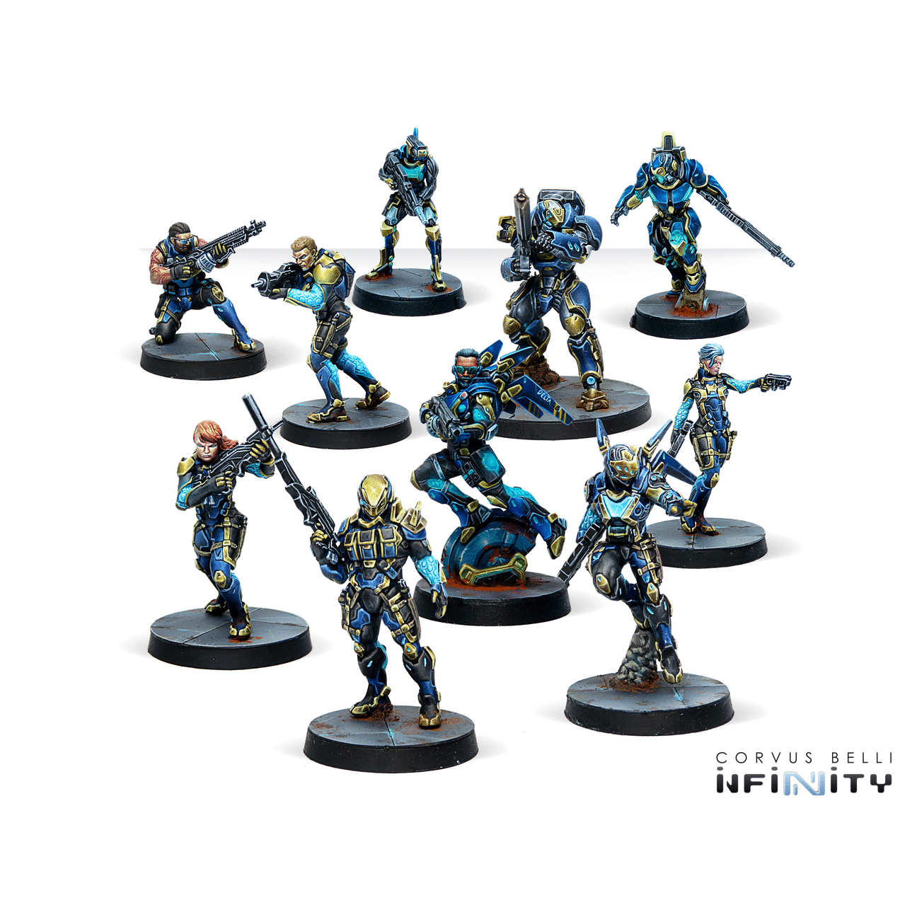 O-12 is an international representational and governing body, evolved from the UN, but with greater autonomy, capacity and decision-making power. Endowed with a tactical police branch, Bureau Aegis, O-12 is the arbiter, judge, and jury of the Human Sphere. This box includes ten miniatures: Three Kappa Units with Combi Rifle, one Delta Unit with Killer Hacking Device, one Epsilon Unit with MULTI Sniper Rifle, one Gamma Unit with Feuerbach, one Gangbuster with Boarding Shotgun, one Betatrooper with MULTI Rifle, one Omega Trooper with HMG, and the special character Cuervo Goldstein with a Boarding Shotgun. The perfect box to start collecting and playing with O-12. RECOMMENDED PRODUCT FOR INFINITY CODEONE Box contains: 3x Kappa (Combi Rifle) 1x Delta Hacker (Killer Hacking Device) (Combi Rifle) 1x Epsilon (MULTI Sniper) 1x Gamma (Feuerbach) 1x Gangbuster (Boarding Shotgun) 1x Betatrooper (MULTI Rifle) 1x Omega (HMG) 1x Cuervo Goldstein (Boarding Shotgun) This product is not a toy. Not intended for use of persons 14 years of age or younger. Miniatures included in our products are provided unpainted. Assembly may also be required. Actual components may vary from those shown.