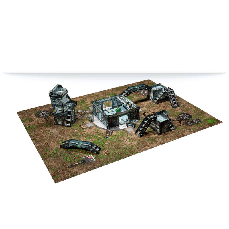 This 3mm cardboard scenery pack, two-sided printed, includes an Objective room, two small buildings, a sniper tower, a console, two bridges, two staircases, an inner ladder, an inner walkway and a 24x32 inch paper gaming mat.