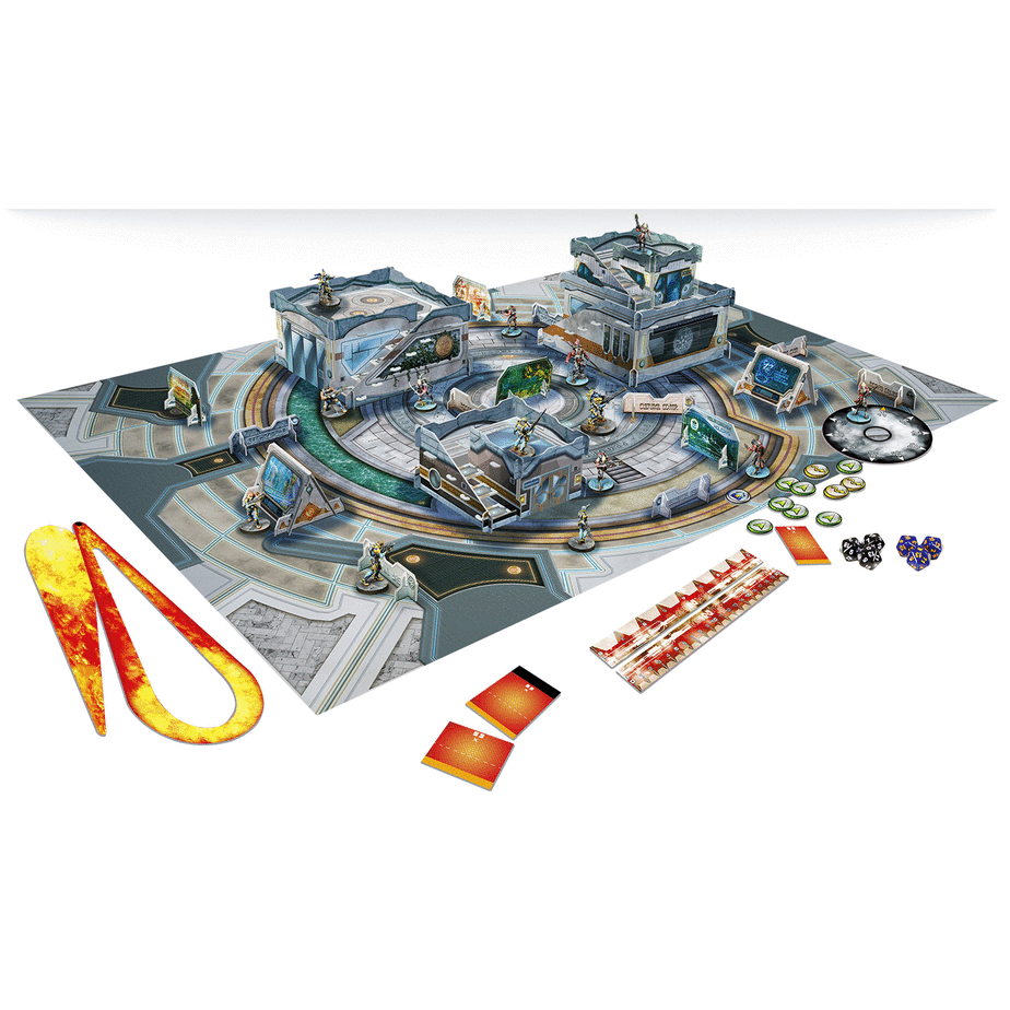 Sálvora Governmental Complex Scenery Pack includes a new ready-to-play double-sided 3mm printed cardboard scenery (4 Buildings, 4 Holoads, 2 Public Consoles and 9 Blast Barriers), and a Game Mat.