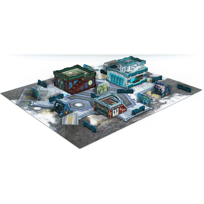 The Kaldstrøm Scenery Pack recreates a colonial settlement in the frozen territories of the planet Svalarheima. This set includes double-sided printed cardboard scenery (4 Buildings, 4 Holoads, 2 Public Consoles, and 9 Blast Barriers), a Game Mat, and also cardboard Markers, Tokens, Templates and a measuring tool. Everything you need to start playing!