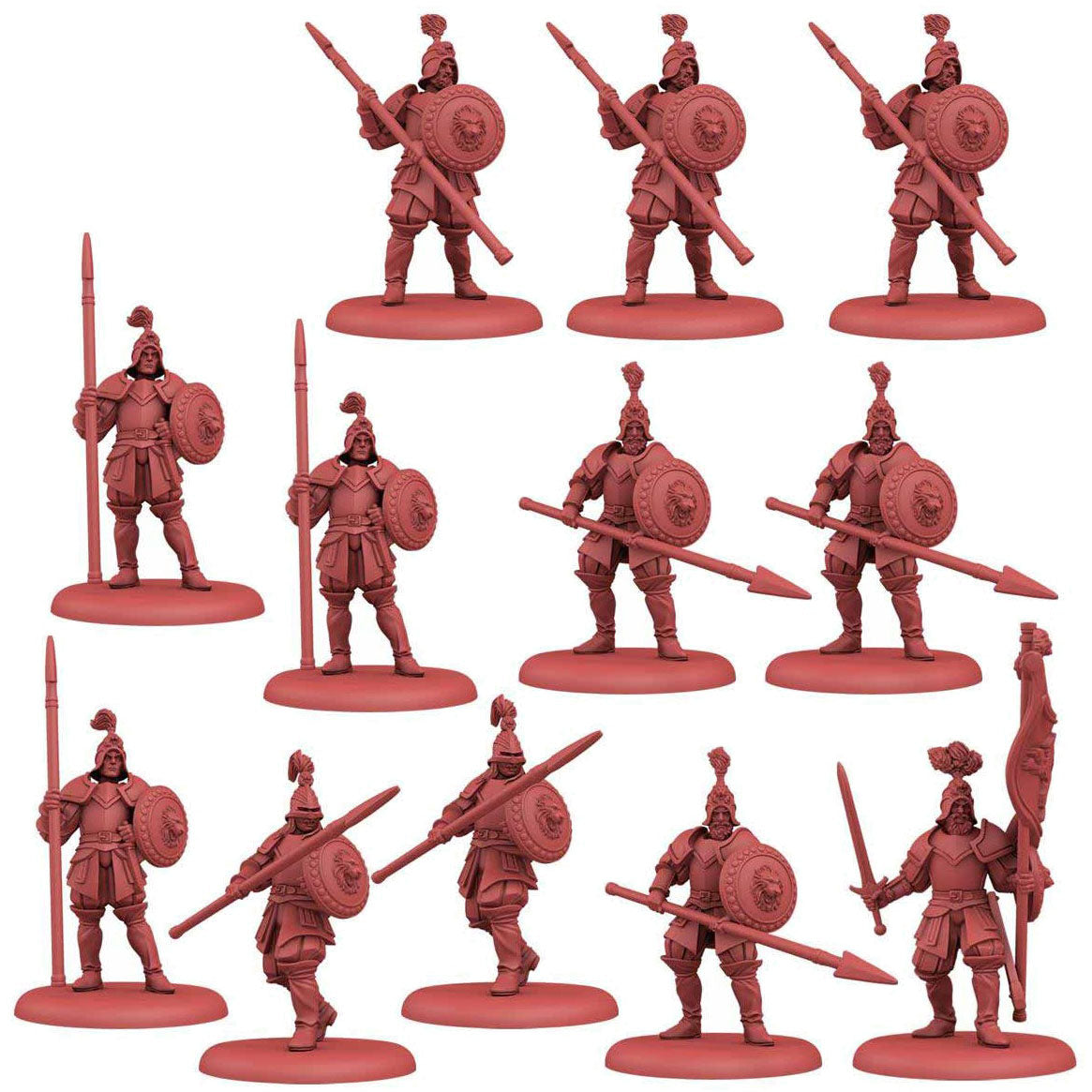 The Lannisport Enforcers Unit Box for the A Song of Ice and Fire: Tabletop Miniatures Game gives House Lannister a new, stalwart unit for their formations. Armed with deadly spears and suited in sturdy armor, they may not be the best choice for a vanguard but having them hold a flank is well within their means as they adapt to both offensive and defensive needs. Plus, their resolve keeps them in a fight, especially when outnumbering the enemy.