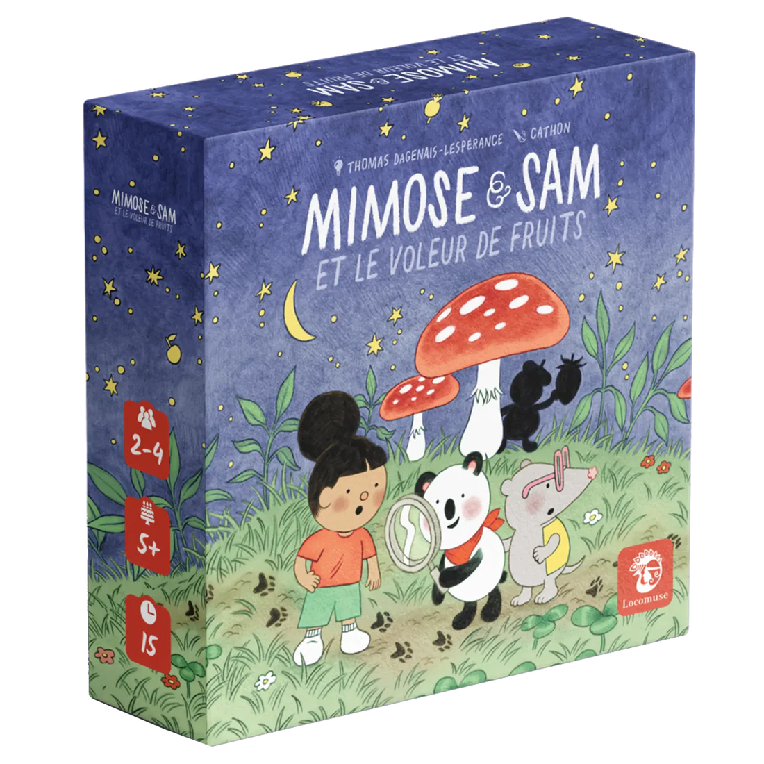 The fruit is disappearing from the garden! Mimose, Sam and their friend Bouillotte are trying to find out who or what is stealing them! ONE player takes on the role of the fruit thief, trying to find all the perfect fruit and get home without getting caught, in time to make a pie for everyone for Mimose's birthday party tomorrow.