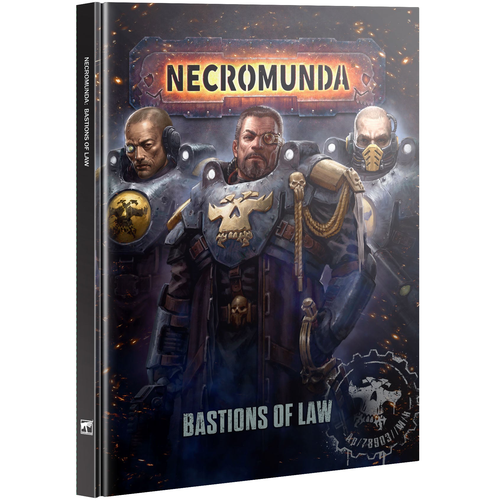 Bastions of Lawis a 128-page supplement for Necromunda, the equivalent of aHouse of…book for the Palanite Enforcers. It covers their background, and contains updated rules for Palanite Enforcer patrols including weapons and Wargear, Hired Guns, Hangers-on, Dramatis Personae, Palanite Drill Skills, and Enforcer Prefectures. There are also two new scenarios, and separate rules to create Badzone Enforcer gangs. You’ll need a copy of the Necromunda rulebook to use this book, and it will be available to pre-order in hardback and ePub formats.