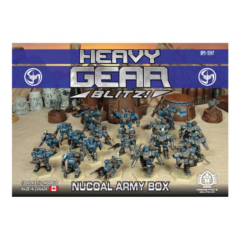 NuCoal Plastic Miniatures Army includes 18 plastic miniatures with lots of extra weapons and parts on the sprues, plus black plastic hex or round bases. Painting and Assembly Required, decals not included. Plastics Made in Canada.
