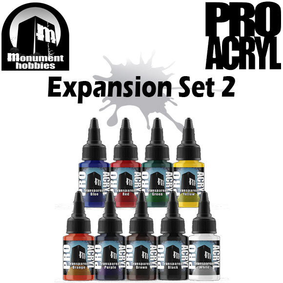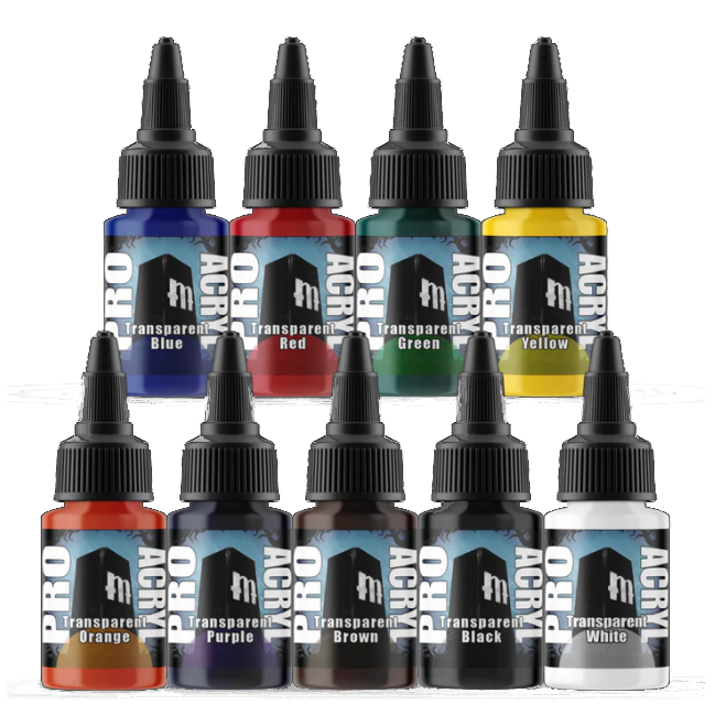 The second expansion to our Pro Acryl paint line! This set includes 8 new transparent colors with the same, amazing Pro Acryl quality. These paints are a game-changer! Simply put, they are our same great acrylics, just with an inherent transparency to them right out of the bottle. They allow the colors underneath to show though and can be used to filter a new color over your base coats, or accentuate a base color with more vibrancy. The magic is in how pigment rich they are, while still maintaining a variable opacity. They can be mixed with each other, as well as any other acrylic paints to achieve just about any color you’d like. Even mix them with our Metallic Medium to get awesome metallic colors. So many uses, you’ll enjoy just playing with them to see what new effects you can create!