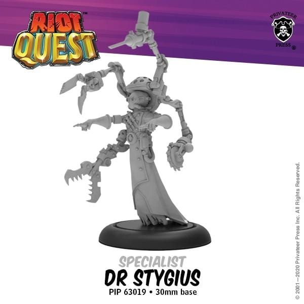 Doctor Stygius is a Specialist Class Hero that brings a unique and powerful ability to any Crew he joins: Healing! In addition to lowering the cost of Riot Gear equipped to himself or to nearby Crew mates, the “good doctor” can also perform some quick surgery to heal damage his “friends” have sustained in the Arena. Stygius also has the power to melt the minds of his enemies from a respectable distance, possibly even disrupting the opponent’s flow of Action Die thanks to his Scramble ability.