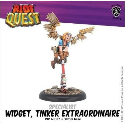 This wiz with a wrench has a place on your bench! As good at fixing things as she is at breaking them—you can see the advantage to that—Widget will leave your opponent asking where this angel got her wings. (Answer: She crafted them out of the sorry scraps of the last scavenger to get in her way.)