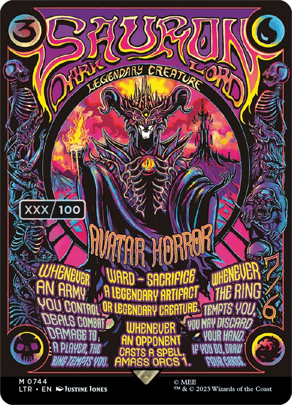 Ward—Sacrifice a legendary artifact or legendary creature. Whenever an opponent casts a spell, amass Orcs 1. Whenever an Army you control deals combat damage to a player, the Ring tempts you. Whenever the Ring tempts you, you may discard your hand. If you do, draw four cards.