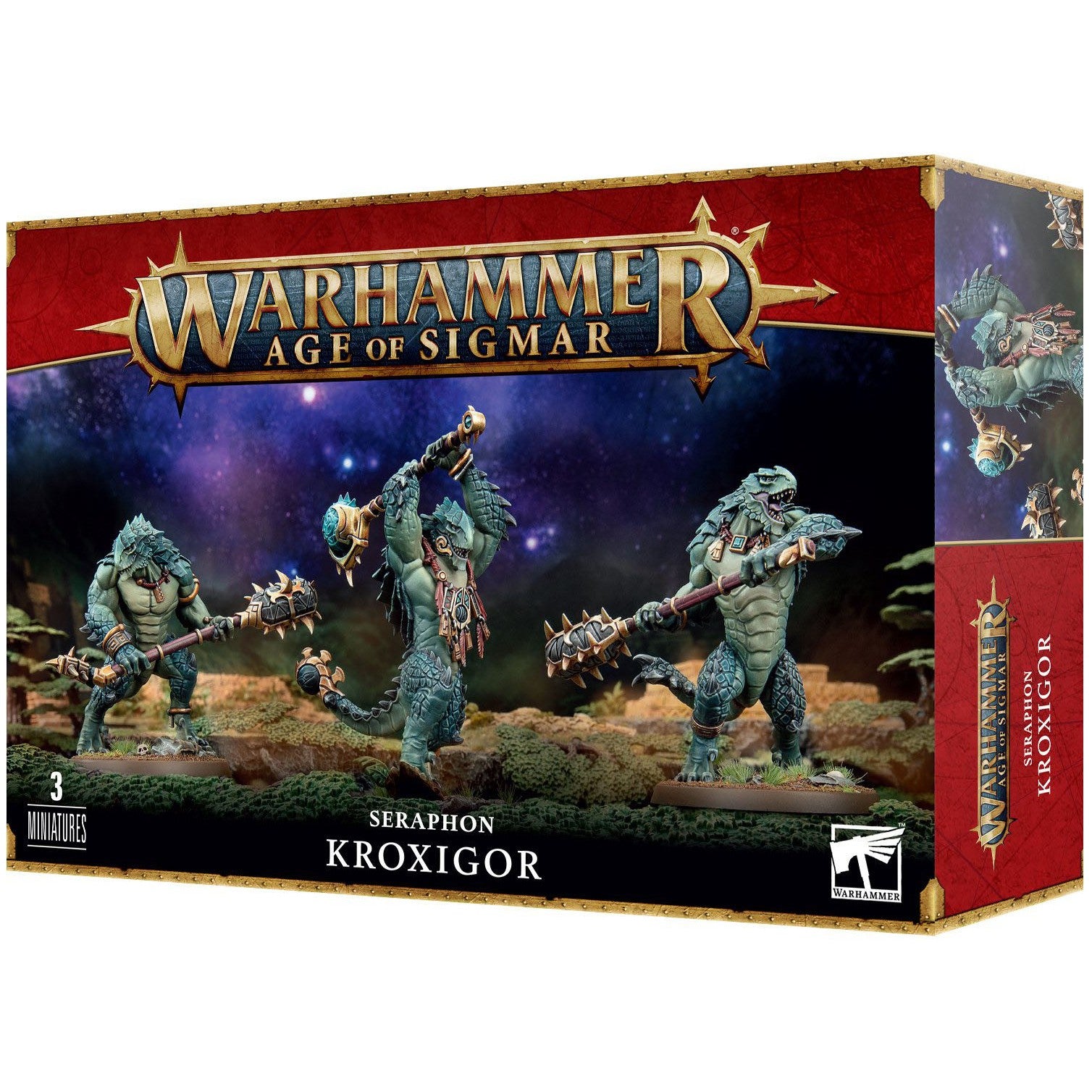 This multipart plastic kit builds three Kroxigor – muscular Seraphon who loom over lesser foes. Each Kroxigor wields a spike-studded drakebite maul, and one can instead be armed with an ornate moonstone hammer. The kit offers a wealth of customisation options – every Kroxigor has a choice of two different heads with thick scaled crests, and two arm poses to swing its massive weapon. The kit also includes three distinct maul-heads and five bony tail tips that can be used with any model, as well as a variety of necklaces and scenic base elements.