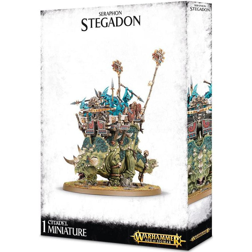 This multi-part plastic kit contains all the components necessary to assemble one Stegadon, featuring a howdah on its back full of murderous skinks hurling meteoric javelins. The howdah also supports a skystreak bow or sunfire thrower, and can bear a Skink Alpha. However you choose to arm it, there are several different configurations available, with extra shields and decoration. Supplied with a Citadel 120mm Oval base.