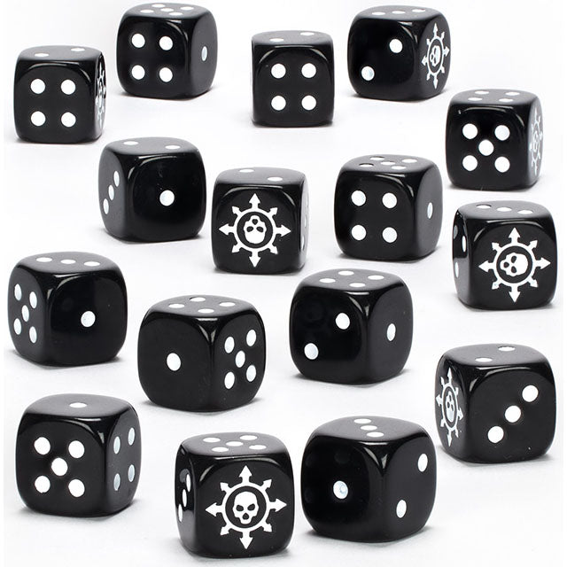 Roll knucklebones blessed by the Gods of Chaos themselves (maybe) with a new set of Slaves to Darkness dice, which includes 16 black plastic dice with white pips and the eight-pointed star of Chaos on the six face.