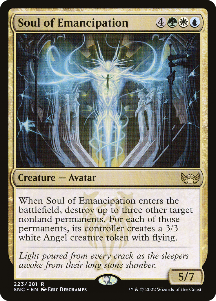 When Soul of Emancipation enters the battlefield, destroy up to three other target nonland permanents. For each of those permanents, its controller creates a 3/3 white Angel creature token with flying.