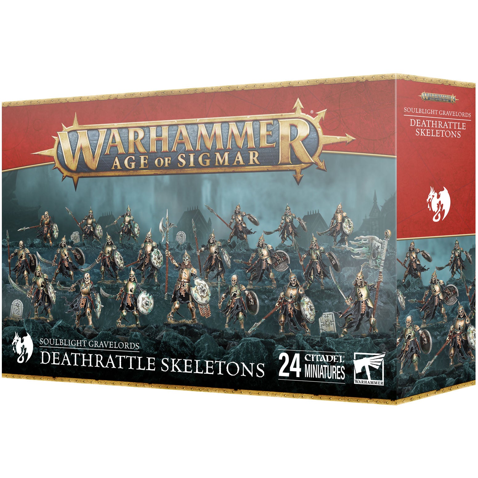 The might of the Barrow Kingdoms comes from their endless legions of Deathrattle Skeletons – undead warriors who march forward in lockstep, grinding their foes down in a battle of attrition, odds firmly in their favour as necromancers raise ever more dead to do their bidding. This updated kit contains 20 Deathrattle Skeletons which have been redesigned to be easier to build, with interchangeable blade, spear, and shield arms, and options to make two champions and two standard bearers. It also includes four cosmetic tombstones.