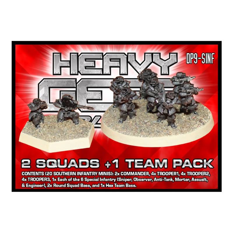 The new Southern Infantry 2 Squads +1 Team Pack has been designed around the new edition rules. A typical squad is now represented by 6 to 8 Infantry minis on a 40mm round bases and a Teams by 2 infantry minis on a hex base. The photos below include a parts photo and a photo of a typical Squad with 1 Commander and 6 Troopers, plus a Special Anti-Tank Missile Infantry added in center to repesent an Anti-Tank Infantry Squad.