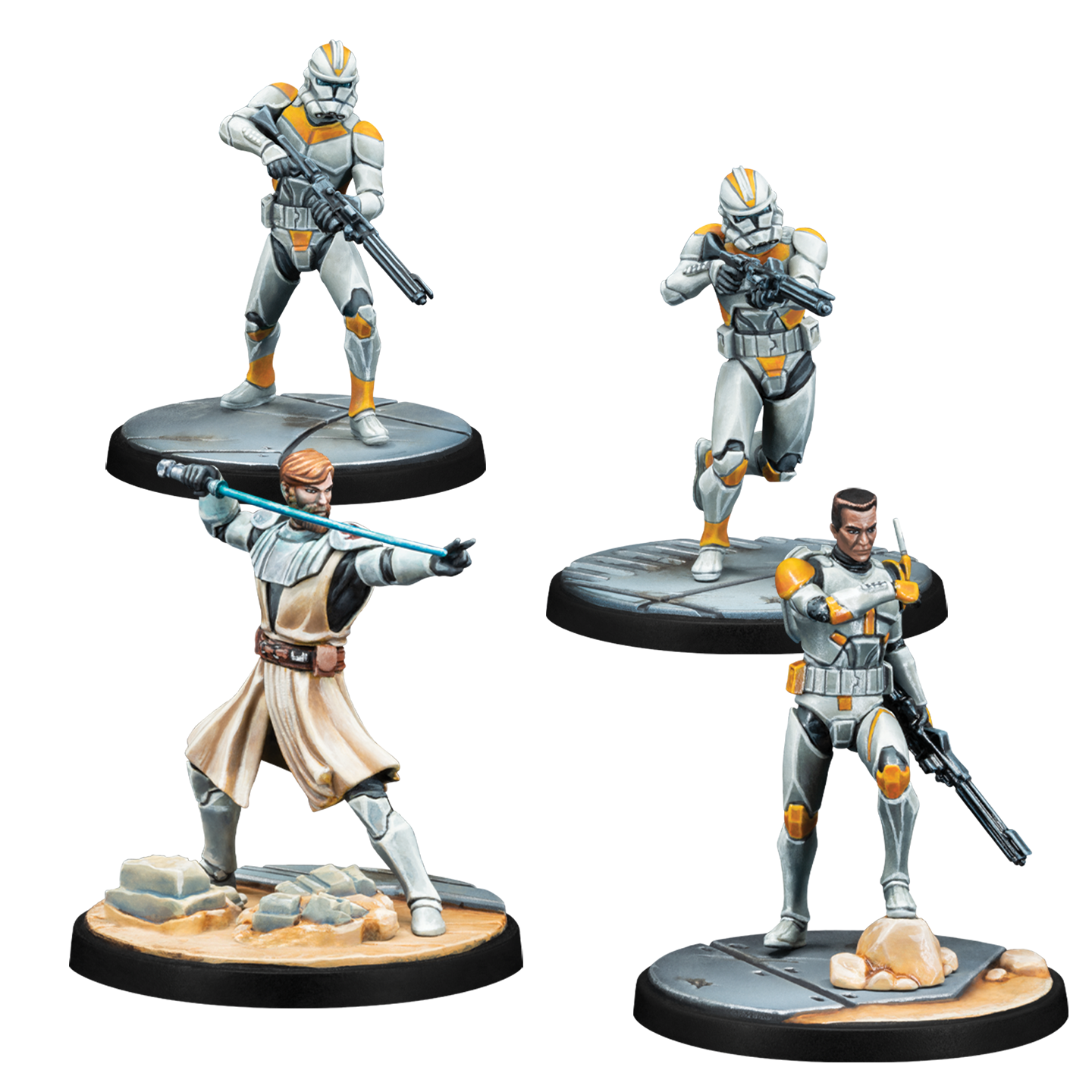 A iconic Jedi General and his allies enter the Star Wars: Shatterpoint in this pack! One of the Republic's most iconic heroes, Obi-Wan Kenobi fights to contain the Separatist threat no matter the cost and this pack adds him, Clone Commander Cody, and two Phase II Clone Troopers from the renowed 212th Attack Battalion to Star Wars: Shatterpoint. Whether using them together as full squad or combining them with other characters, the beautifully sculpted miniatures in this pack are accompanied by the Unit, Order, and Stance cards players need to unleash their unique abilities on the battlefield.