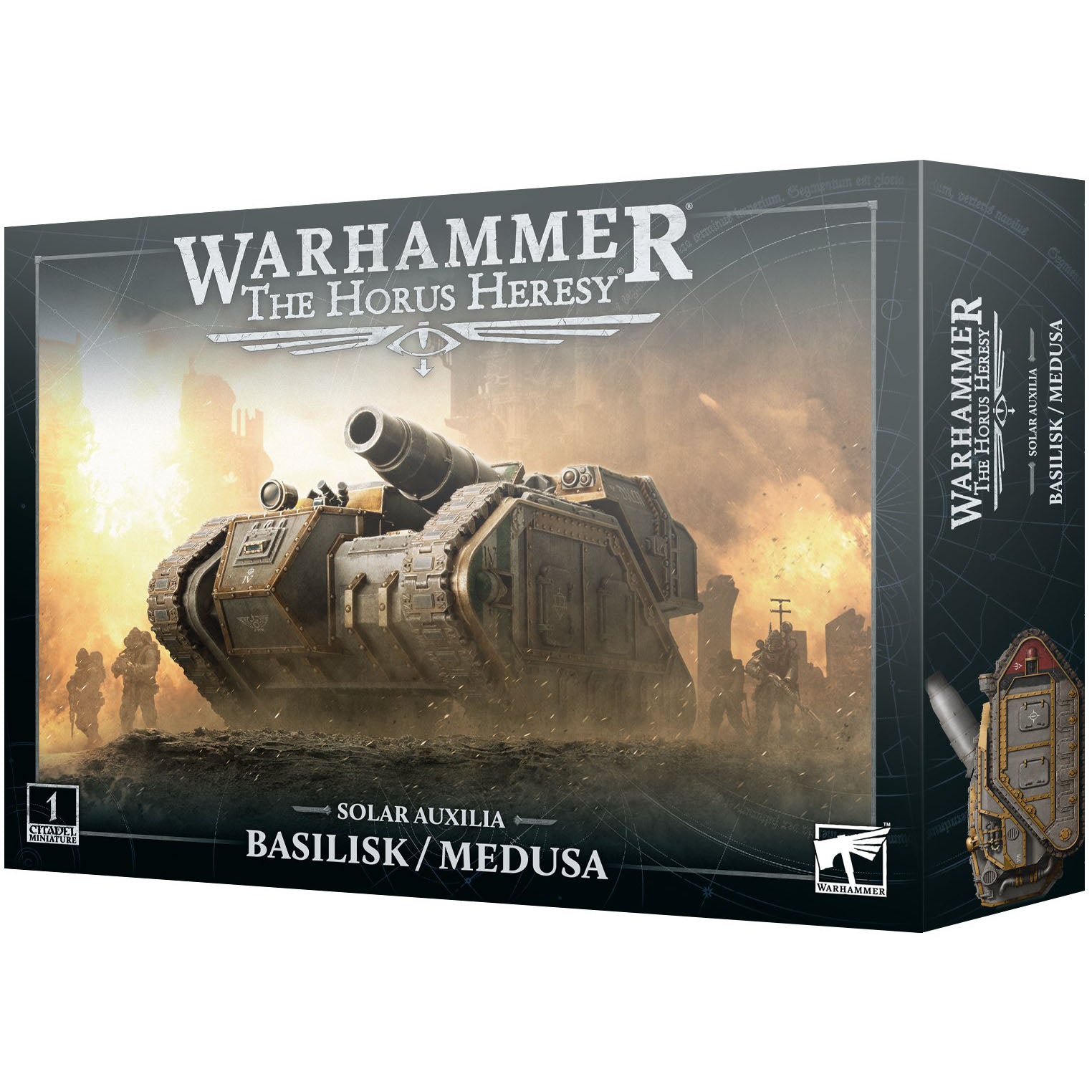 This multipart plastic kit builds one Solar Auxilia Basilisk or Medusa, an armoured artillery tank mounted with a powerful siege gun. The Basilisk's long-barrelled Earthshaker cannon hurls explosive shells across incredible distances, while the Medusa's mortar fires munitions heavy enough to shatter mighty walls. The tank has a fully detailed interior, and the rear door and roof can be opened to reveal two crew loading its siege gun. Both the gun and rear door feature glueless assembly options, allowing you to adjust their positions mid-game.