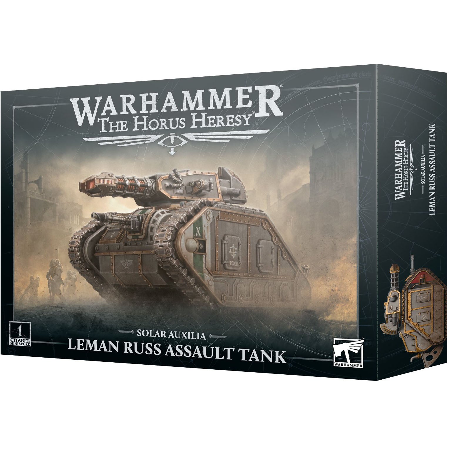 This multipart plastic kit builds one Solar Auxilia Leman Russ Assault Tank, a formidable vehicle with a selection of powerful guns. Its turret houses one of three primary weapons – an explosive demolisher cannon, advanced Executioner plasma cannon, or a searing volkite macro-saker. It also sports a hull-mounted weapon – a heavy bolter, lascannon, autocannon, multi-laser, or heavy flamer. The turret and both weapons feature glueless assembly, allowing you to adjust their positions mid-game.