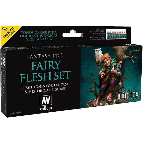 Set of Fantasy Pro colors for skin tones with intense colors for small scale fantasy figures, or low saturation natural skin colors of historical figures or figures in war scenarios. Contains 8 bottles in 17 ml./0.57 fl.oz. and detailed step by step instructions by Nocturna Models.