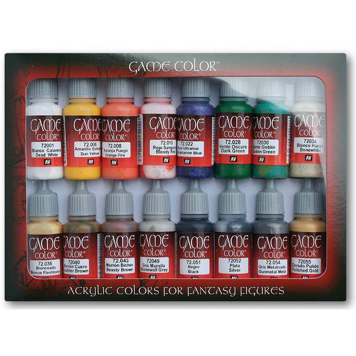 Set of 16 Game Color references for painting models and miniatures. Contains 17 ml./0.57 fl.oz. bottles and a color chart.