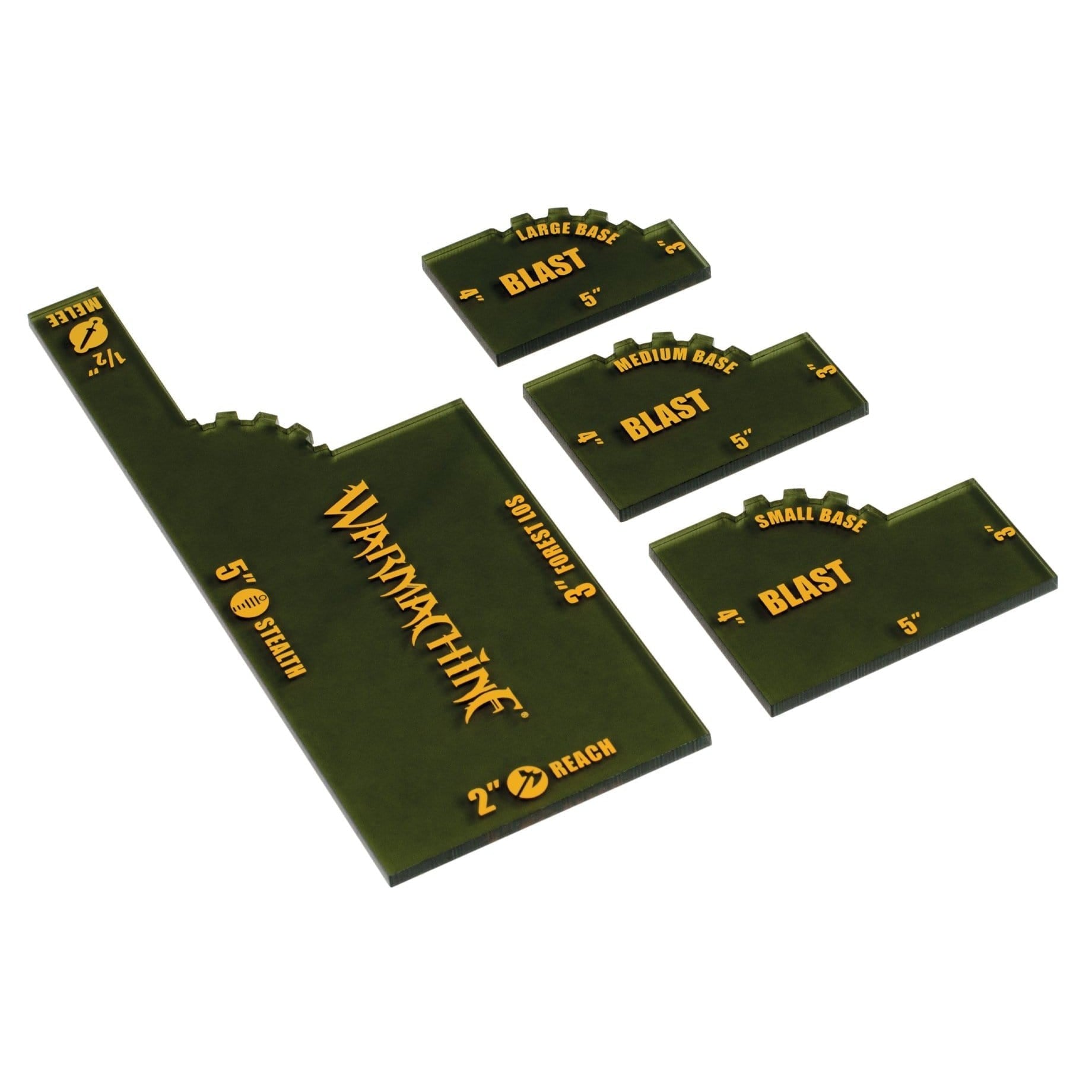 This official WARMACHINE measuring key set (PIP 91085) includes one multipurpose measuring key, one small-base blast measuring key, one medium-base blast measuring key, and one large-base blast measuring key. Use these tools to precisely measure melee ranges, distance to targets with stealth, line-of-sight through forests, and blast areas around directly hit models.