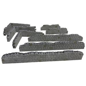 Vieux murs de pierres usés par le temps, très faciles à assembler et peindre. Idéal pour ajouter un peu de couvert sur un champ de bataille un peu dégarnie, mais vraiment pas efficace pour mélanger une salade. Cette ensemble contient de quoi faire 3 coins, deux longueurs de 3 pouces et trois longueurs de 6 pouces.