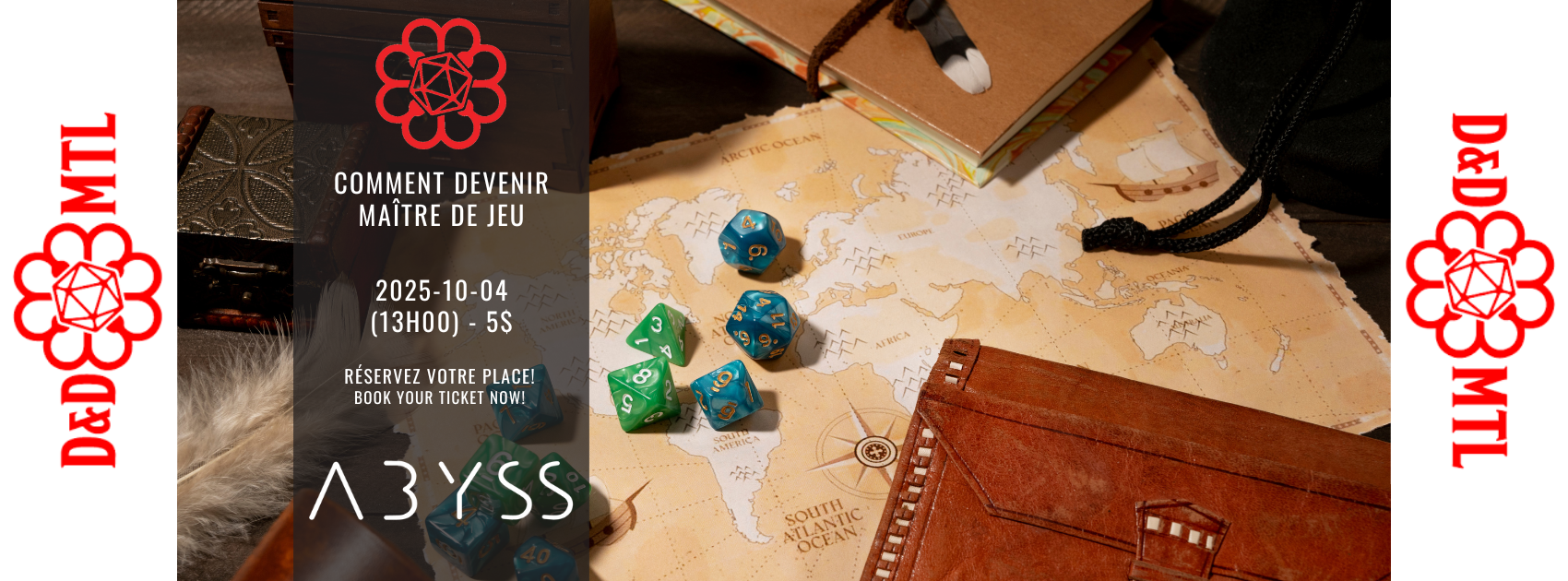 Tu aimerais animer tes propres parties de jeux de rôle, mais tu ne sais pas par où commencer ? DnD Montréal organise un atelier le 4 octobre à 13h à l’Abyss pour initier celleux qui le souhaitent au rôle de Maître de Jeu.