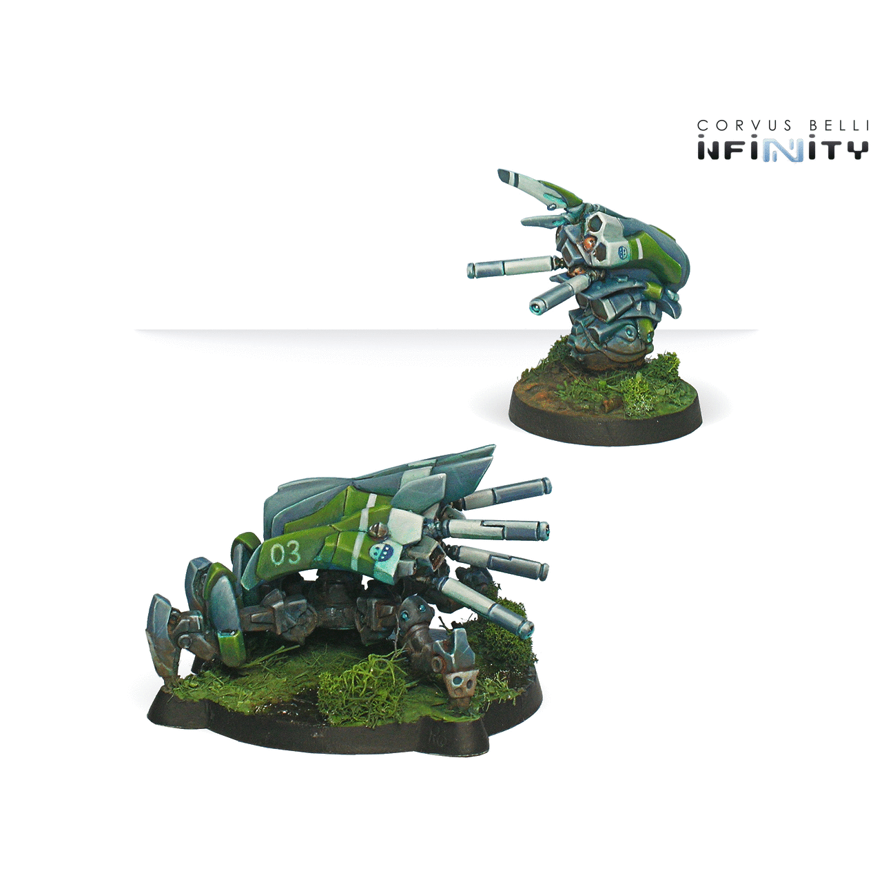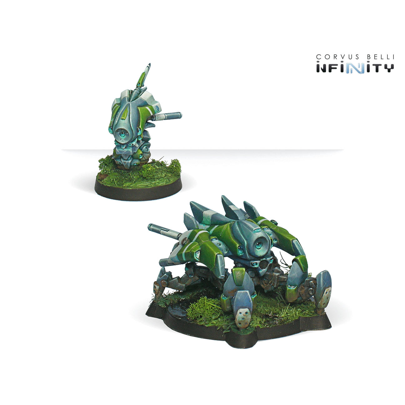 Armbot is the designation for attack Remotes used by the PanOceanian Military Complex. They are designed to be faster than Heavy Infantry troopers but lighter, easier to manufacture and cheaper than a T.A.G., while carrying support weaponry. PanOceania used this design methodology during the hectic arms race of the NeoColonial Wars to get highly mobile fire platforms at a low cost.