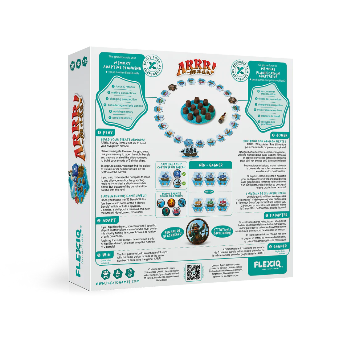 ARRR… ! Ohé, pirates ! Pars à l'aventure pour construire ta propre armada pirate ! Navigue habilement sur les mers changeantes, utilise ta mémoire pour ouvrir les bons tonneaux et capture ou vole les bateaux nécessaires pour bâtir ta flotte. Mais attention à Barbe Noire, aux tourbillons, aux tonneaux explosifs et au Kraken ! Le premier pirate à réunir une armada de 3 bateaux avec la même couleur de voiles ou le même nombre de voiles, remporte la partie !