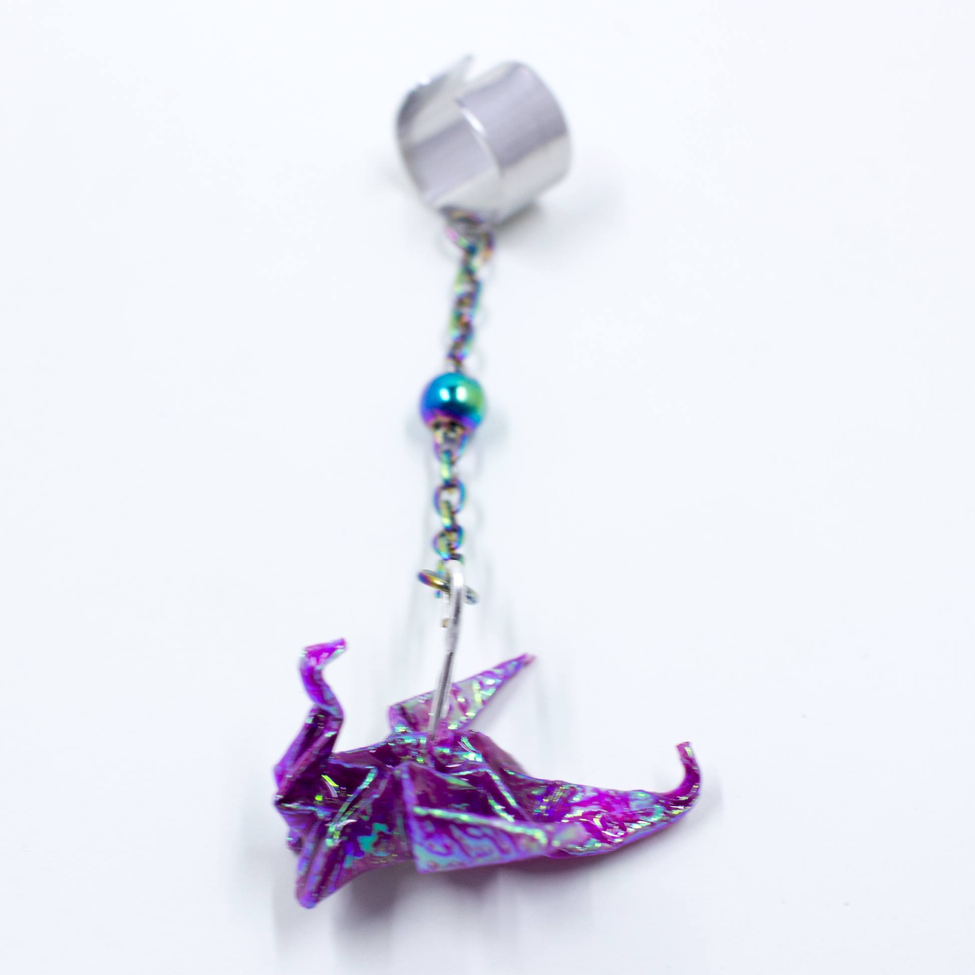 1 Earcuff with a hand folded origami dragon suspended from a subtle rainbow chain.
