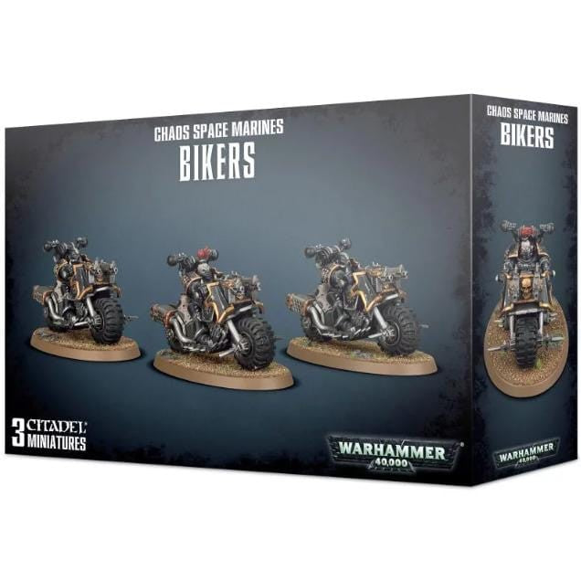 This box is the most cost effective way to buy three multi-part plastic Chaos Bikes. The bikes can be armed with bolters, and there are bolt pistols with which to arm the Bikers. Also included is a Chaos Space Marine Transfer Sheet.